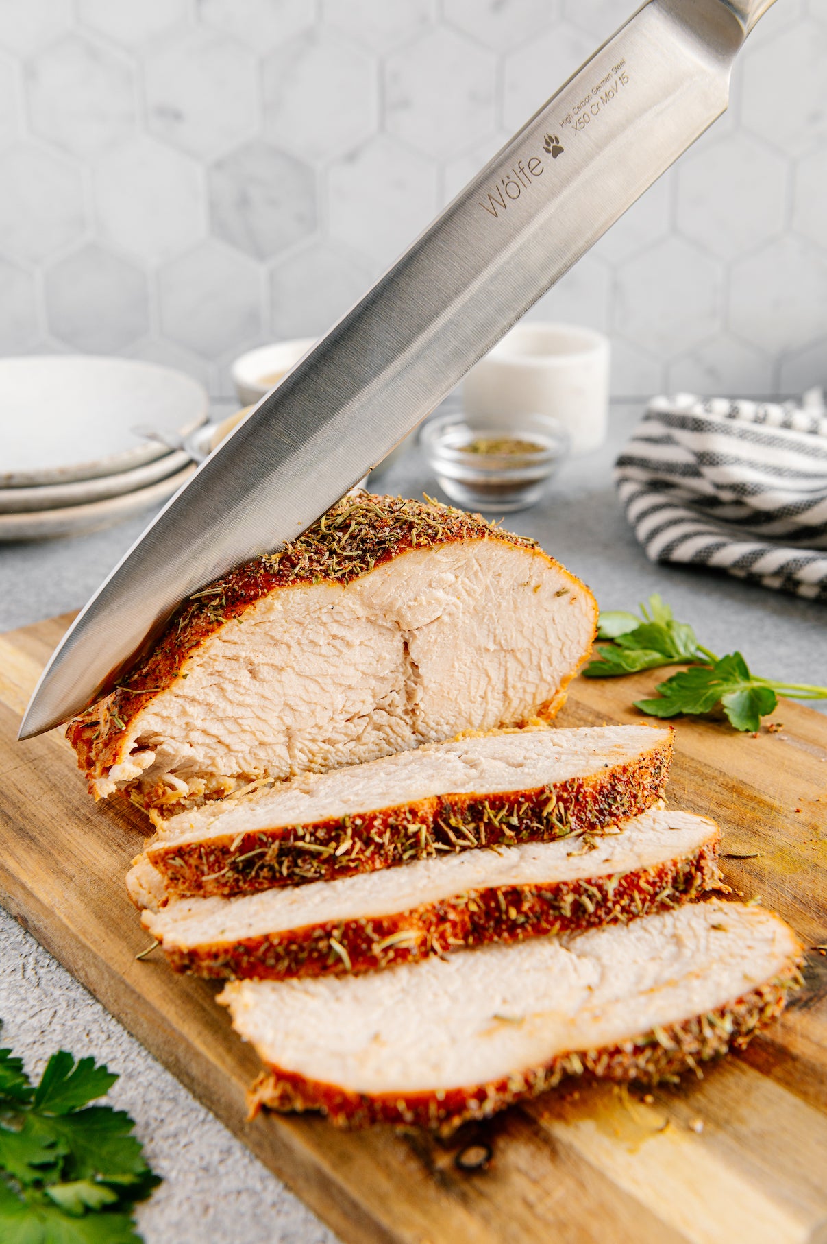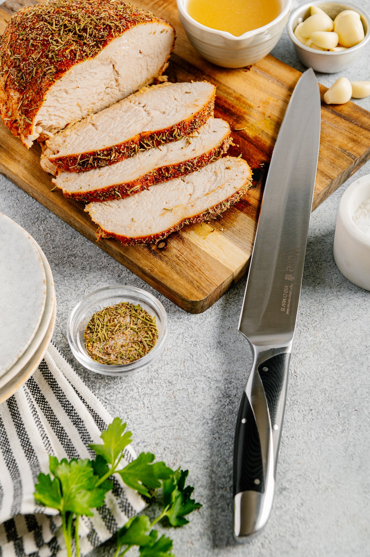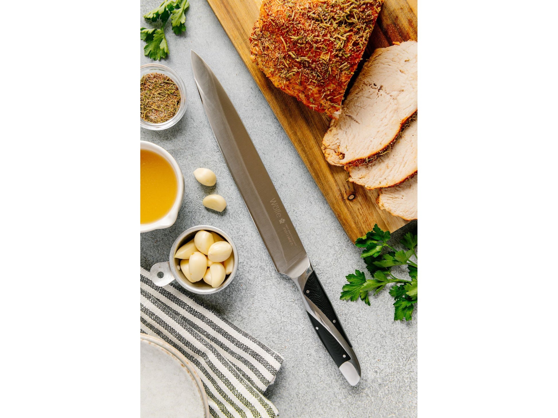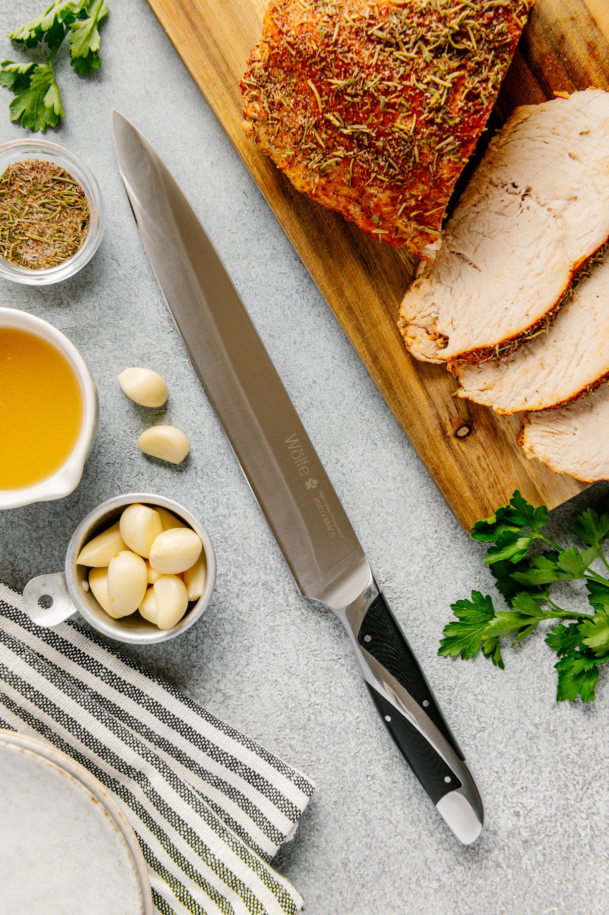 This knife is crafted with premium carbon-alloy German steel for lasting performance. It is 9 inches long and is the ideal tool for carving meats and slicing fish.