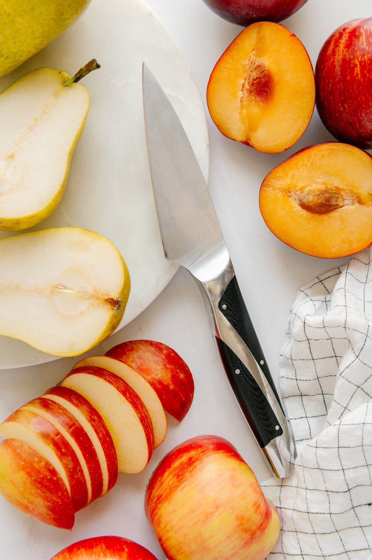 This knife is crafted with premium carbon-alloy German steel for lasting performance. It is 3.5 inches long and is the ideal tool for dicing, slicing, and chopping vegetables and fruits. For many customers, this replaces their paring knife.