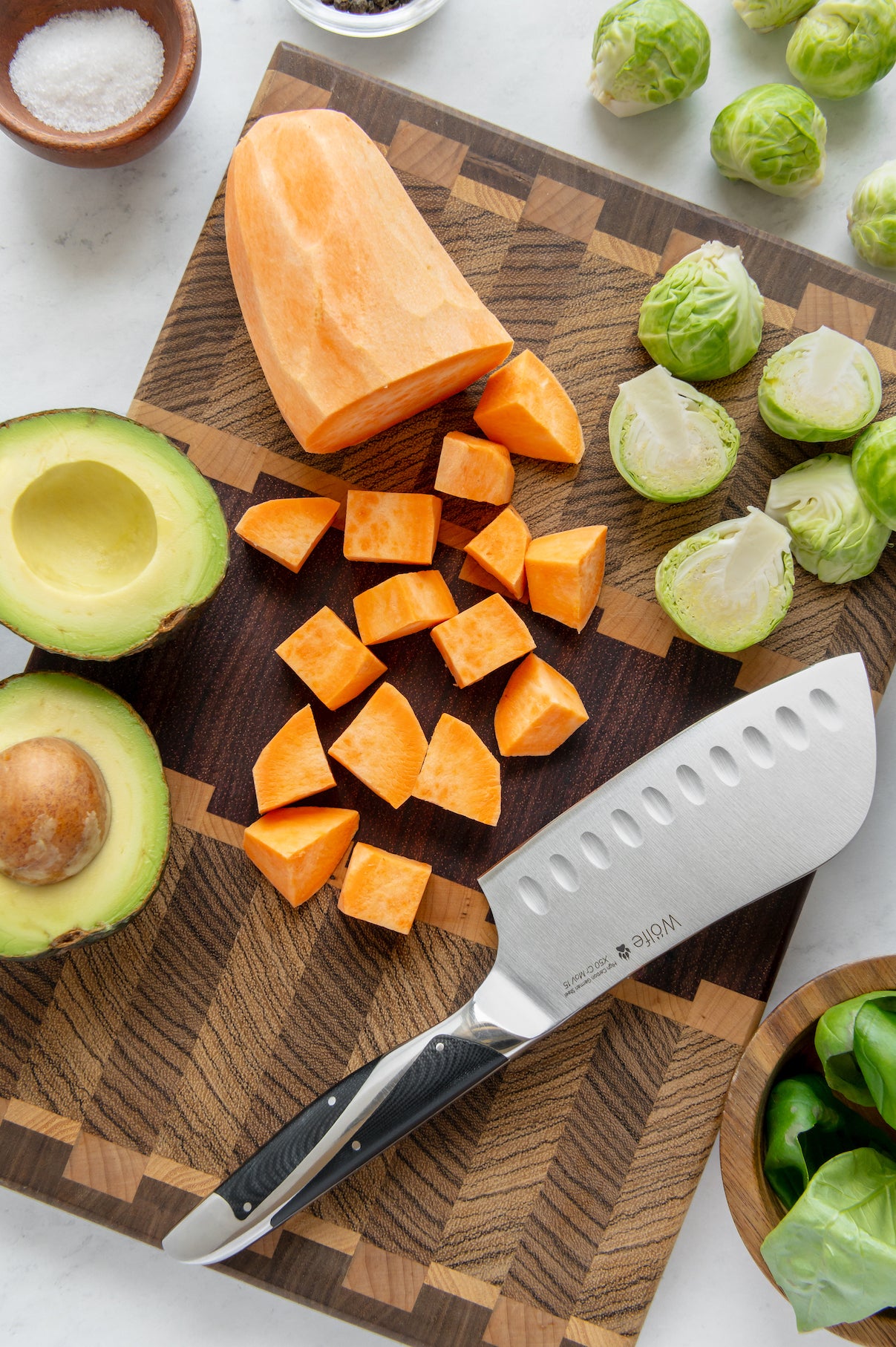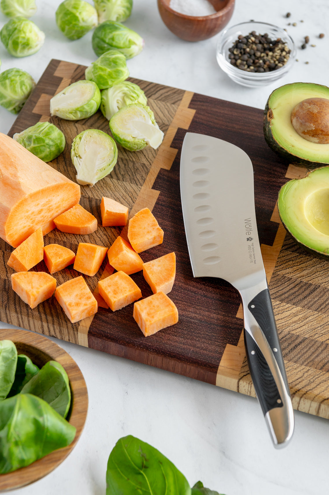Forged from carbon alloy German steel. A small cleaver designed for chopping and dicing root vegetables such as sweet potatoes, carrots, brussels sprouts, and jicama. This knife is also excellent for shaving dense items like chocolate.