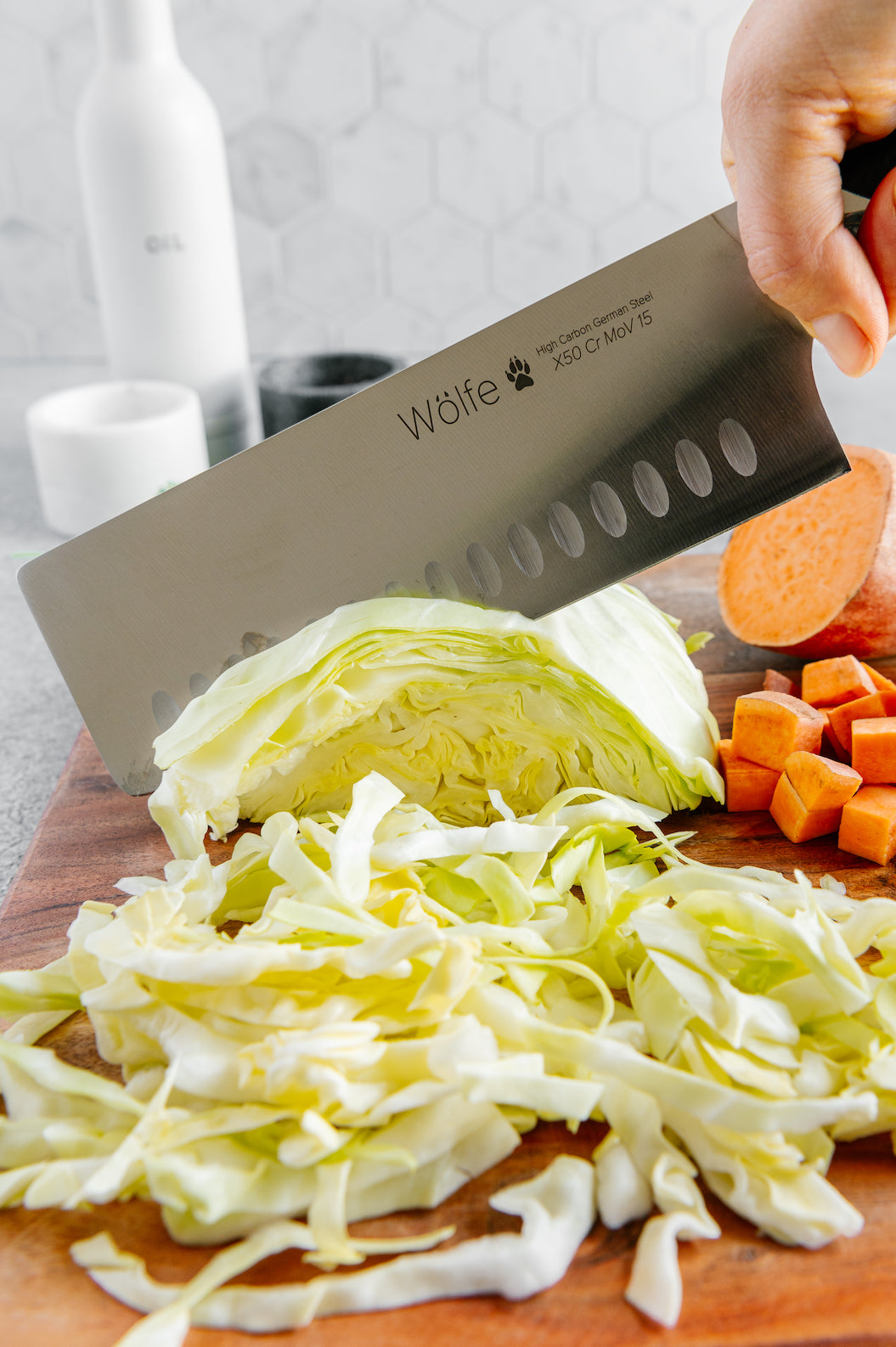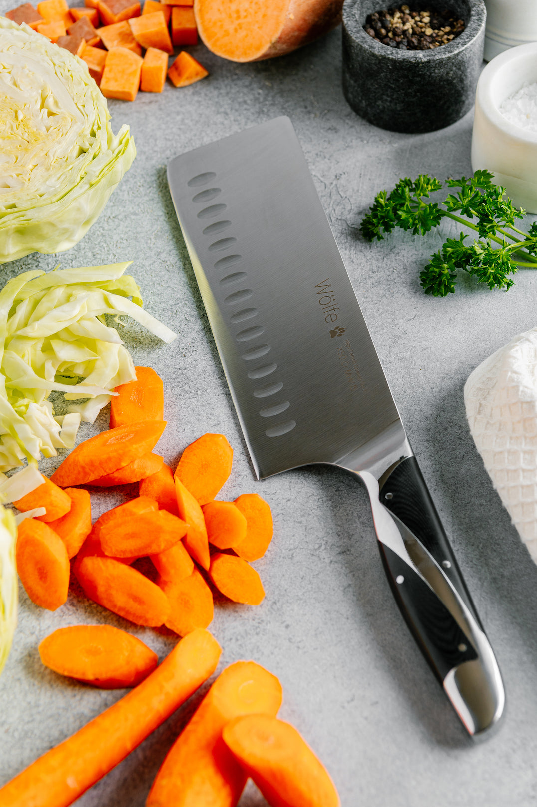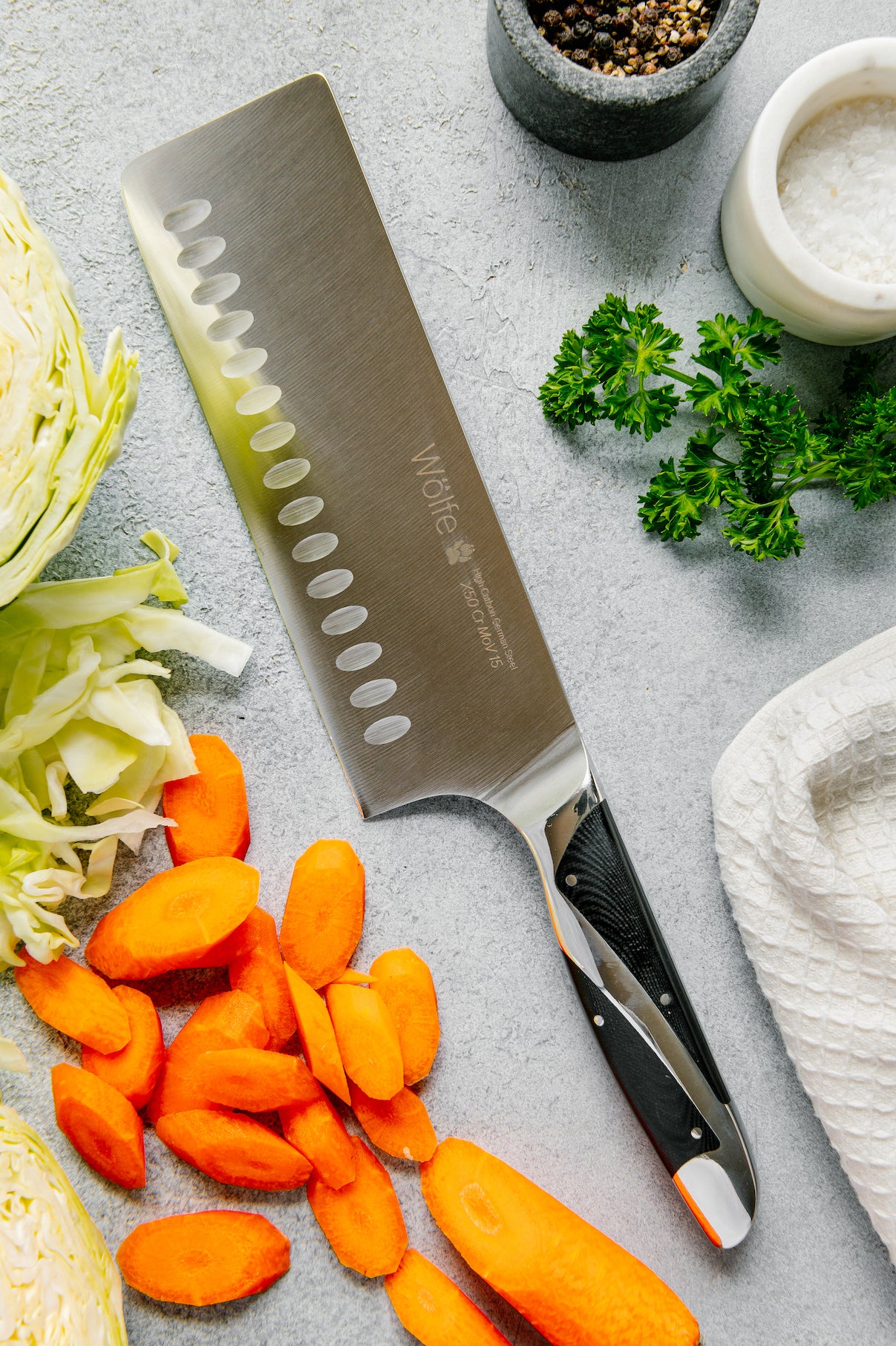 This knife is crafted with premium carbon-alloy German steel for lasting performance. It is 7 inches long and is one of our favorite chopping knives. This knife is perfect for the most demanding food and meal prep where a lot of chopping and dicing is required. Wölfe cutlery features a G10 handle material, a synthetic resin known for its superior durability, perfect for both professional kitchens and enthusiastic home cooks.