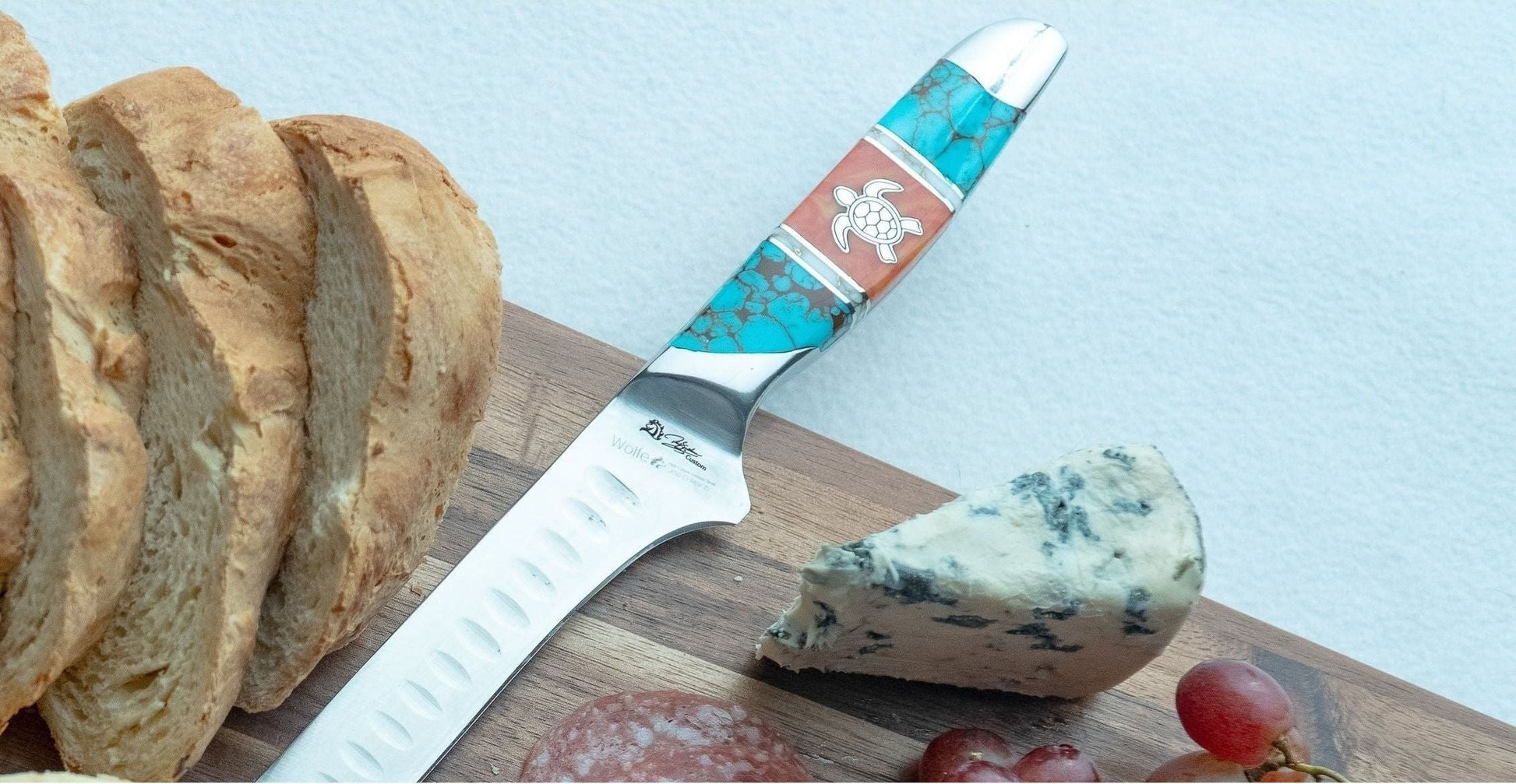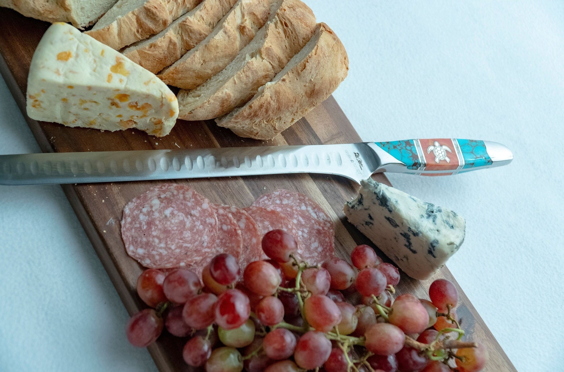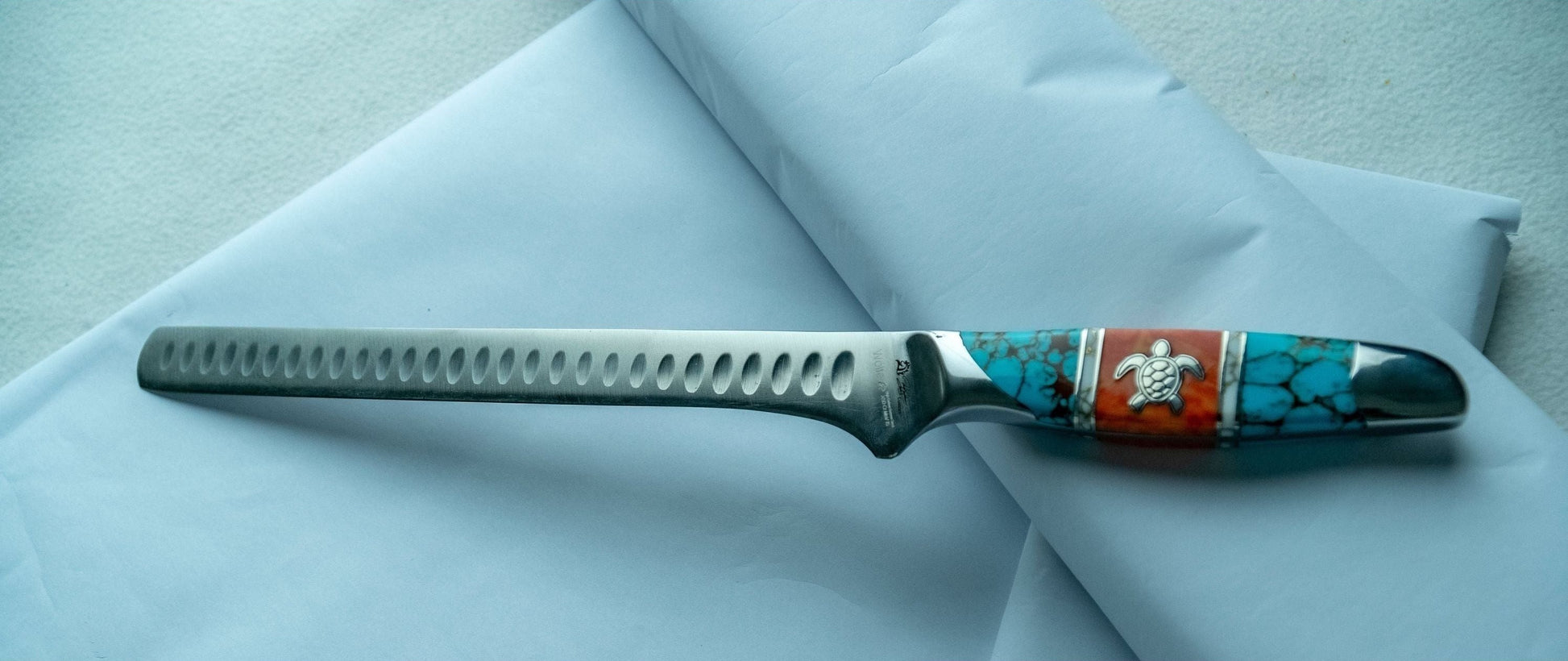 Featuring blue turquoise, white turquoise, and orange spiny stone, this custom-handled knife is hand worked by world-renowned Navajo Artist David Yellowhorse on the Navajo reservation. David's artistic handles have been synonymous with pocketknives for decades. For the first time, he has partnered with Wölfe Cutlery, a kitchen knife line, to bring his artistic vision to life in kitchens and dining rooms worldwide. Use this commemorative carving knife for turkey and ham at your holiday meals; also used for perfect slices of brisket, tenderloin, or roast beef. It also makes a great knife for cheese, salamis, and bread on charcuterie boards. The orange spiny stone hearkens to Hawaiian sunsets, while the white turquoise symbolizes Hawaii’s white sandy beaches. The blue turquoise, a stone of significance to Native Americans, represents David's Navajo heritage as well as Hawaii's blue ocean waters, binding two cultures together. Finally, his artistic vision culminates with the sea turtle, a creature sacred to the Hawaiian people as it embodies good luck, protection, endurance, and long life.